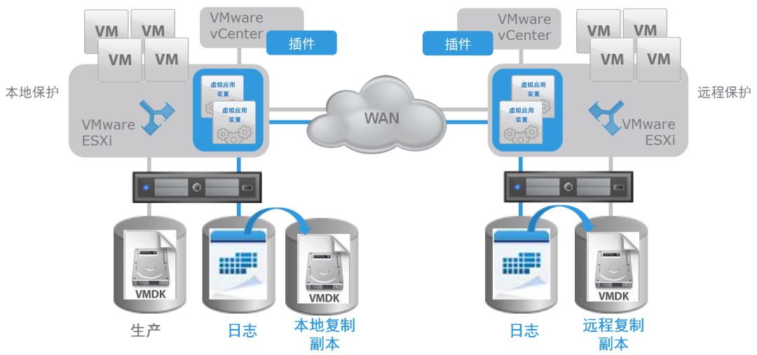 在两地三中心架构中,RecoverPoint for VMs可实现数据压缩进行广域网传输,减少网络带宽占用,并支持“同步”和“异步”两种容灾方式。