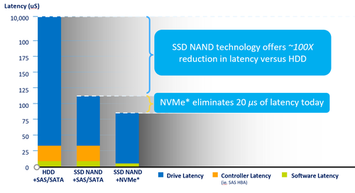 如下图所示,采用NVMe接口的SSD比采用SAS接口的SSD延时可以降低约20微秒,即延时减少20%~25%。