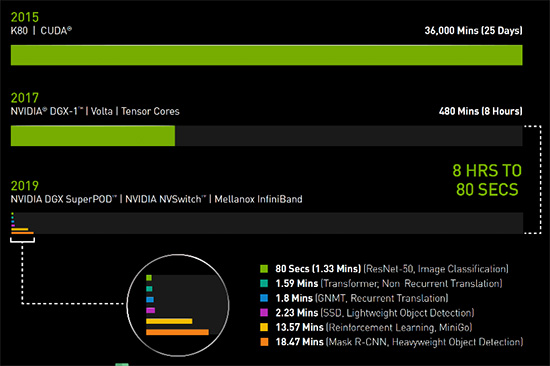 而如今,同样的任务, NVIDIA DGX SuperPOD使用相同的V100 GPU,采用Mellanox InfiniBand进行互联,并借助可用于分布式AI训练的最新NVIDIA优化型AI软件,仅需80秒即可完成。