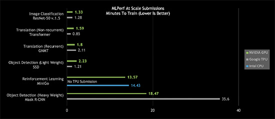 更进一步观察会发现,针对重量级目标检测和强化学习,这些最困难的AI问题,NVIDIA AI平台在总体训练时间方面脱颖而出。