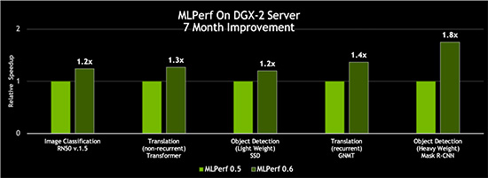 借助在CUDA-X AI软件堆栈上的创新,NVIDIA DGX-2H服务器的MLPerf 0.6吞吐量比NVIDIA七个月前发布的结果提升了80%。