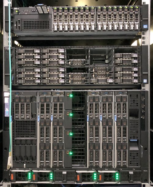 与机架上半部分4U的戴尔易安信存储SC7020和2U的PowerEdge R720相比,7U的MX7000在“内容”和功能上具有明显优势。