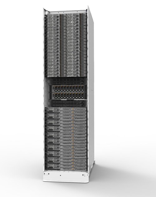 用于超大规模数据中心的整机柜服务器,共享电源与散热模块,前端利用模块化设计的机架式服务器实现高密度部署