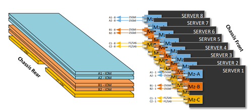 如果将上文中的12Gb/s SAS适配器与MX5000s交换机,替换成16或32Gb/s FC适配器和MXG610s交换机,就可实现对外部FCSAN存储的支持。