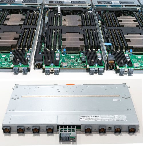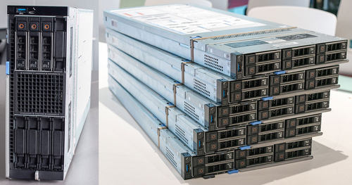 ▲5个并排的MX740c计算节点,支持双路处理器和六通道内存