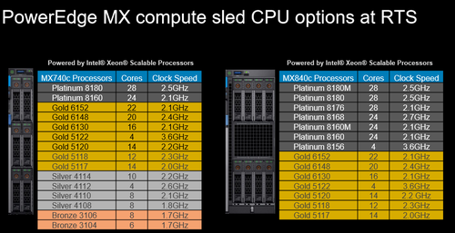 MX7000的计算节点采用的是英特尔至强可扩展处理器(Intel Xeon Scalable Processor,XSP),主要区别在于,MX740c为双路节点,可支持从铂金到铜牌的几乎全系列可扩展处理器;而MX840c为四路节点,只能使用至强铂金和金牌处理器(银牌和铜牌仅支持双路配置)。