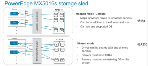 此外,12Gb/sSAS接口连接背部的MX5000s SAS交换机,可通过MX 5016s存储模块获取存储资源。相比FX2s上Dual PERC设计的FD332存储节点只能为两个计算节点提供存储资源,使用SAS交换的MX5016s的存储资源分配将更加灵活。