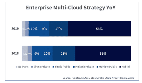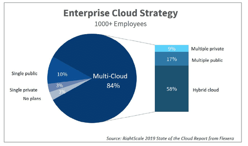全球云管理服务厂商RightScale每年都会在全球范围内开展云计算趋势调查,对全球上千位企业级客户雇员进行详细的访问并据此发布云计算发展趋势调查报告,而从RightScale 2019年发布的云计算趋势报告中,我们可以看到这样一个趋势——多云战略成为企业级客户的首选。
