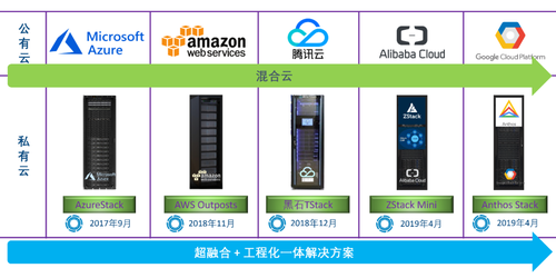 不过相比云,超融合系统还欠缺一些自动化和可视化的功能,也没有云管平台的自助服务模式。在此背景下,各大公有云厂商纷纷推出了On-premise的私有云版本,清一色采用基于超融合架构的工程一体化交钥匙方案。