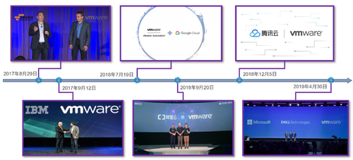凭借其在虚拟化市场的领先地位及良好生态,VMware得到各家公有云厂商的认可和接纳,主流公有云纷纷向VMware发来好友申请。