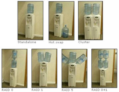 第二张图也不难理解,看地上那个水桶。所谓Hot swap概念上来说类似于热备份。它的数据读取方式类似于Standalone,唯一不同的是,有一块备用的硬盘在时刻准备着。一旦正在使用的硬盘出现了问题,那么备用硬盘就要及时更换上,以免造成损失。但这样的方式也存在着一些弊端,比如硬盘更换需要时间,这对很多企业来说是致命的。