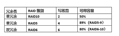 从性能的角度,由于写惩罚的影响,RAID 10 的写性能通常优于RAID 5和RAID 6,因此对于性能关键型应用,客户希望底层采用RAID 10的方式。然而从磁盘利用率的维度,RAID 10的可用容量只有50%,却也是不合算的(见下图)。