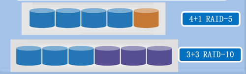 ➤ 假设客户一共购买了11块大小相同的硬盘(如600G 15K,标称随机 IOPS 180),为了获得更好的写入性能,取6块硬盘构建RAID10的组合,写入IOPS 540,挂载给数据库应用,容量利用率50%,也就是1.8TB(此处忽略1024和1000的磁盘容量计数差别)。剩下的5块硬盘构建RAID5的组,以获取更多的容量,写入IOPS 225,容量2.4TB,挂载给备份应用。