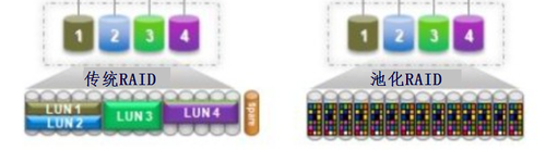 这种方式实现了性能与容量的平衡,但也有一些缺陷,由于切分了很多磁盘组,磁盘组之间的IO资源是无法共享的。因此作为应对方案出现了资源池化的技术。