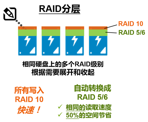 简而言之,RAID分层技术就是把来自主机的数据以RAID 10的方式写入磁盘,然后利用内部机制,在线完成数据到RAID 5的转换,实现实际占用空间的节约。