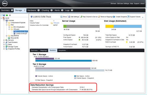 在进行数据分层,保存回放的同时,如果客户需要,SC存储还能做一件事情,数据去重与压缩。压缩和去重的好处大家都明白,但性能的疑虑又产生了,毕竟需要切片,计算特征值,比对等等一系列的事情。这点SC存储比较务实,去重压缩的目的是为了缩减空间,找一个空闲的时间慢慢做。数据先写入RAID 10,然后在转换成RAID 5的时候把这个事情一起做了。