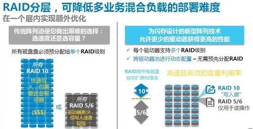 要知道,RAID 10和RAID 5在随机写方面性能差异明显,但读性能是基本相当的,采用这种技术,读写性能都能达到较优状态。另一方面,由于把磁盘空间从RAID 10转换为RAID 5,整体空间利用率有所提升,真正实现了容量和性能的平衡。