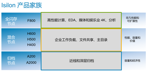 同样的,Isilon也包含三个系列的硬件产品,即全闪、混合与归档节点,分别对应客户不同的性能、容量和应用场景需求,如下图所示: