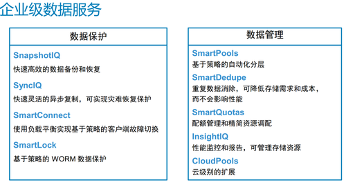 而Isilon也不遑多让,它拥有丰富而强大的企业级软件数据服务,这些软件的加持,如同给Isilon披上了一件“万龙甲”,从数据备份到远程容灾、从自动分层到资源调配、从安全加密到消重压缩,配合硬件即可神力全开,任凭外界天雷滚滚,我心自有定海神针。