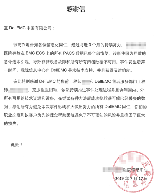 如信中叙述,戴尔易安信成功地将遭遇严重进水意外的ECS上的数据恢复回来,使该医院得以避免经济损失,更重要的是,医疗数据的恢复也间接帮助大量病患得到医院的及时救治。