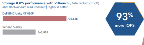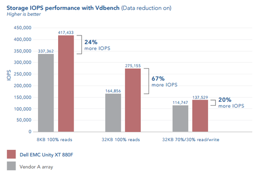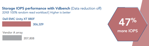 根据测试,戴尔易安信Unity XT 880F具备显著的性能和数据缩减优势,如果使用A厂商的存储系统,客户只能在性能或效率之间选一个,而使用Unity XT的话,客户就能两者兼得,无需妥协。