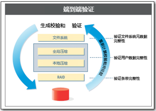 端到端验证能够确认数据是正确的,并可从系统的每一级进行恢复。如果此过程出现问题(例如磁盘驱动器上的某个数据位发生了翻转),系统也能捕获。