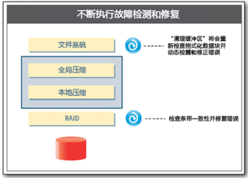 DD OS的连续故障检测和修复可以在出现存储系统故障时提供保护,系统会定期重新检查RAID条带和容器日志的完整性,并利用RAID系统的冗余性来修复所有故障。在每次读取时,系统都会重新验证数据完整性,并动态修复任何错误。