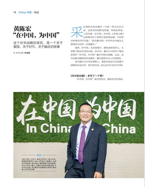 采访黄陈宏是在戴尔(中国)的北京办公室。这里有面很鲜亮的墙,草绿色背景,上面写着:在中国,为中国。《环球人物》记者顺手拍了张照片发到朋友圈,不到两分钟便有同行回复:“是在戴尔吧?在华外企中能这么强调这句话的一定是戴尔。”