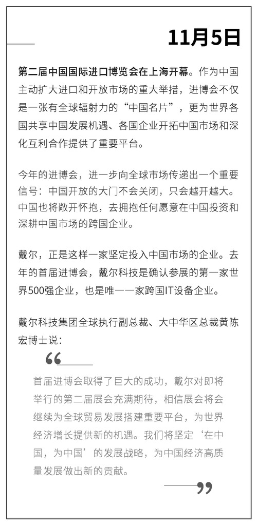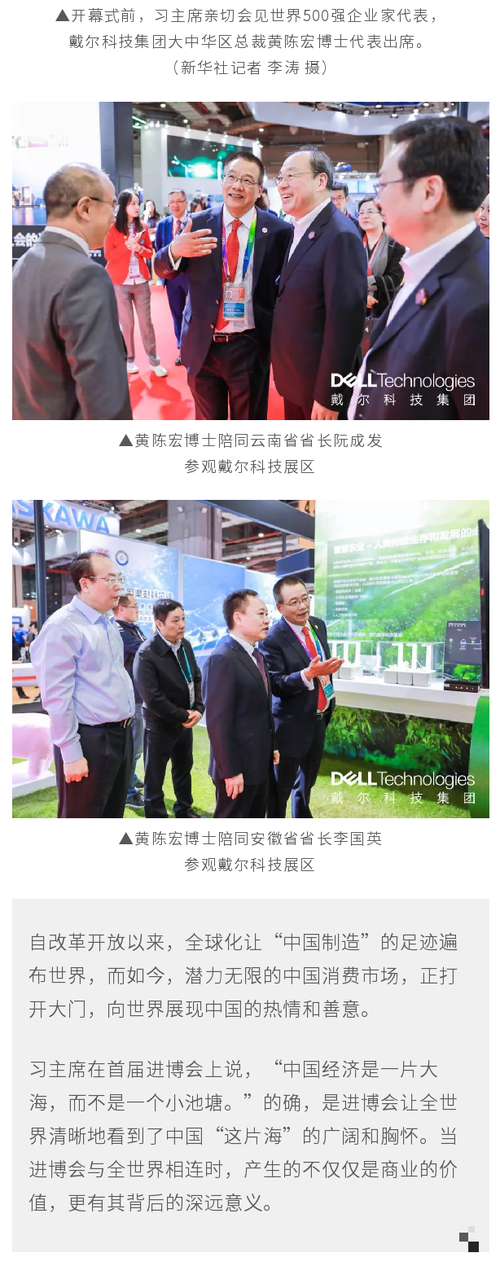 “中国市场这么大,戴尔一定要多看看。本届进博会‘质’与‘量’进一步提升,进博会的‘朋友圈’越来越大。明年进博会我们还会来,因为中国正在成为一个更加开放、更加稳定的国际市场。中国经济发展前景一定会更加光明,也必然更加光明。”