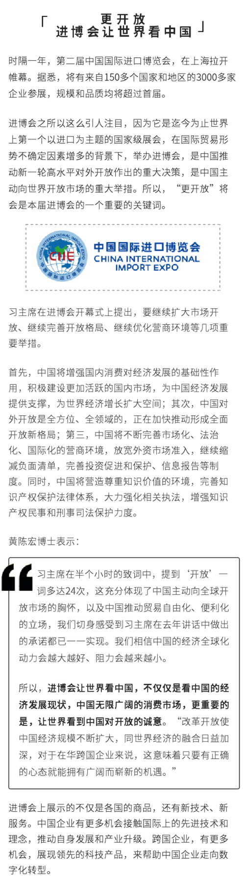 尤其是,很多传统企业在转型升级过程中需要大量的先进制造设备,以提高生产线的竞争力和生产力,进博会让他们有机会和世界上优秀的科技公司产生直接的对话,甚至通过技术的升级,走出国门,去看到更大的世界。