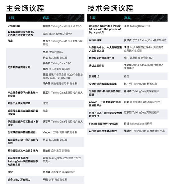 本次T11大会共设置数据智能峰会与数据智能技术峰会两大会场:数据智能峰会将重磅发布TalkingData新战略、新模式、新技术与新产品,并邀请金融、零售、营销、互联网等行业的合作伙伴,共同探讨数据智能驱动行业转型发展的实践案例;数据智能技术峰会则将重点关注大数据与人工智能技术的创新发展,并邀请各领域技术专家,分享技术实战经验和各行业场景中的创新应用。