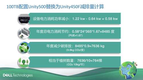 比如,同样是存储,全闪存存储比磁盘阵列价格要高,所以磁盘阵列更好?显然不是,戴尔易安信 第五代存储,其100TB有效容量的全闪存存储 相比100TB有效容量的普通磁盘阵列,占用的空间更少、消耗的电力更少、需要的制冷更少。以戴尔易安信Unity450F为例,100TB配置Unity500替换为Unity450F,每年即可减少碳排放7636公斤,相当于764棵的植树数量。性能提升不说,还为客户省下了真金白银,更为节能环保做出贡献,一箭三雕。