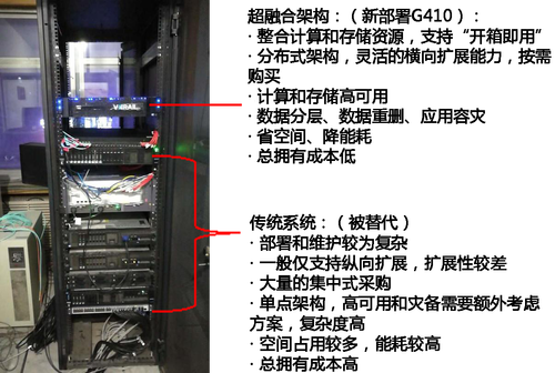 随着IT技术的发展,计算及存储的硬件更新换代特别迅速,处理能力飞速发展,云化,容器化,超融合,全闪存等技术的应用,更使IT基础架构的资源部署更加灵活和高效,机柜布局更加紧凑,设备能耗大幅降低,并在处理能力和扩展性增强的同时,保持了较高的资源使用效率。请看一下对比:
