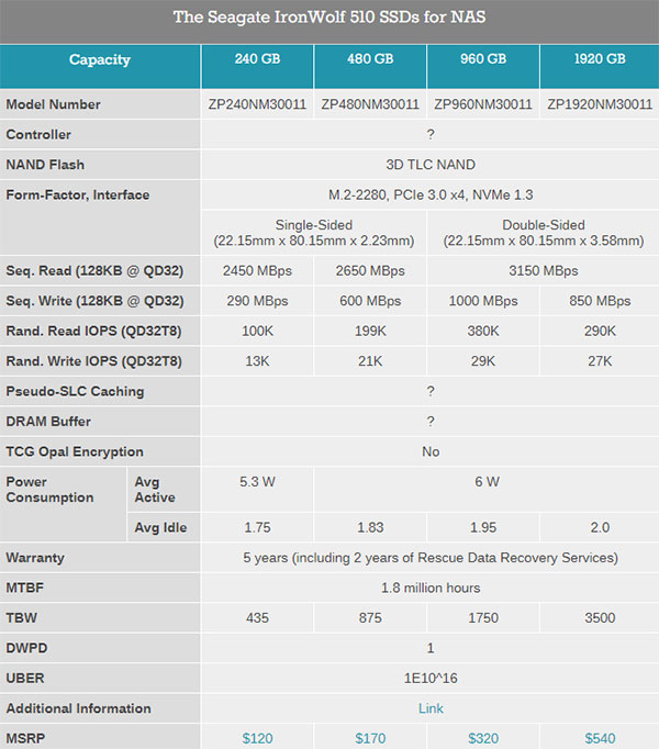 采用3D TLC,容量240GB、480GB、960GB、1920GB,平均故障间隔时间180万小时,支持每天一次全盘写入,终身最大写入量分别为438TB、876TB、1752TB、3504TB。希捷为它提供了长达五年质保,包含两年的数据恢复服务。