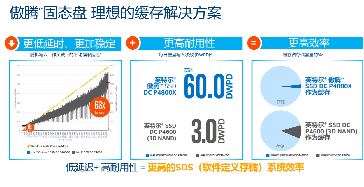 英特尔傲腾固态盘DC P4800X相比英特尔3D NAND固体盘始终保持低延迟、更高的耐久性和更高的效率