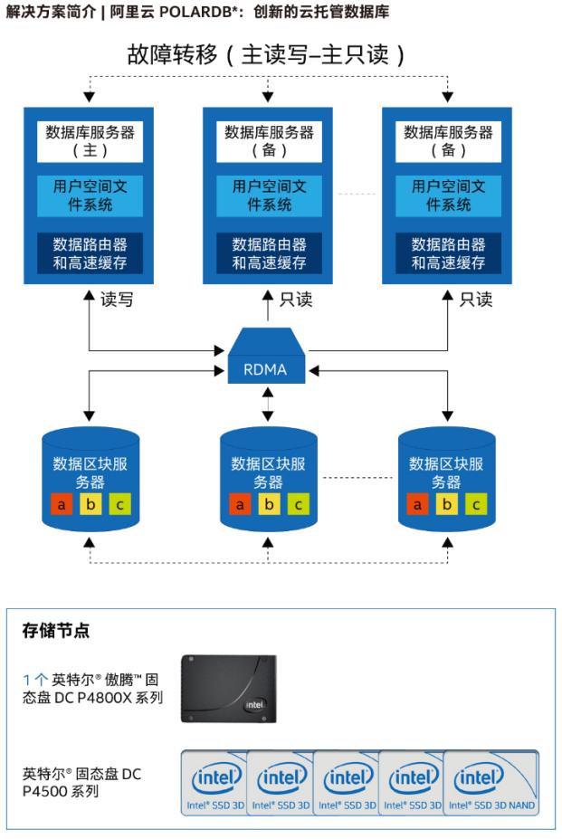 POLARDB以分布式共享存储架构为基础,使用了英特尔傲腾DC固态盘(SSD)和英特尔3DNAND固态盘。英特尔傲腾DC固态盘P4800X系列硬盘可以用来速创建日志记录和索引,借助英特尔傲腾DC固态盘和英特尔3DNAND固态盘,阿里云实现了POLARDB每秒查询数(QPS)提升30%,改善了客户体验。