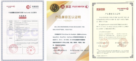 CERTIFICATION级别认证,即所有产品已经达到中标麒麟Linux操作系统的通用兼容性要求及性能、可靠性要求,能满足用户的关键性应用需要。同时,经龙芯中科技术有限公司、上海兆芯集成电路有限公司与富士施乐的严格测试证明:富士施乐55款机型在龙芯3A3000平台上顺利安装、运行良好,且整体系统运行稳定;在兆芯ZX-C、ZX-C+、KX-5000、KX-6000处理器和中标麒麟桌面操作系统软件V7.0平台上功能、性能、兼容性、可靠性、稳定性,可满足用户应用需求。