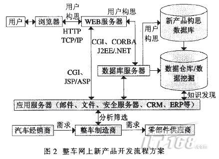 汽车整车制造企业可在自己的网站建立“新产品构思”的交互性栏目。企业利用J2EE或.NET技术再加上oracle SQLserver数据库便可轻松地 建立该栏目。“新产品构思”包括登录客户的姓名、电话、地址、新产品构思细节以及新产品构思效果图等内容。当用户将自己的构思内容填 人网页表单中的相应空白处后,可单击页面中的提交按钮便可将用户所填写内容通过互联网传递到企业的后台“新产品构思”数据库中。利用 “新产品构思”数据库和系统数据库可以产生数据仓库,利用数据仓库进行OLAP(联机分析)和数据挖掘,进行智能化的决策。
