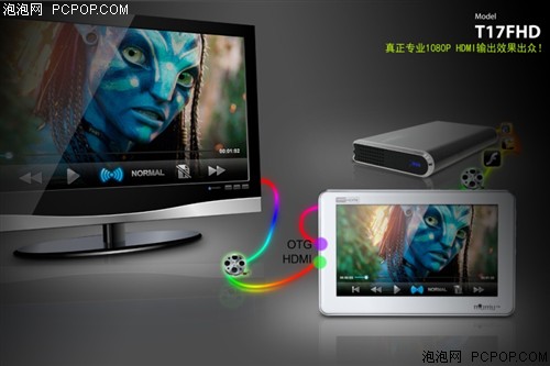 T17FHD采用白色钢琴烤漆材质外壳,纤薄机身非常轻巧,易于携带,微拱形的金属按键帽使用舒适,手感清脆,支持1080P视频播放,HDMI高清输出等。T17FHD搭载了4.3英寸、800×480分辨率显示屏,视频方面,该机支持1080P全高清播放,广泛支持H.264、MPEG-1/2/4、Real Video等多种视频编码,同时增加了对Flash文件的播放支持。音频方面,采用Cirrus公司的独立音频解码芯片,支持MP3、WMA、WAV、OGG、AAC、FLAC、APE等多种音频格式,可选择JAZZ、CLASSIC、POP等常见音效,支持LRC歌词同步显示。