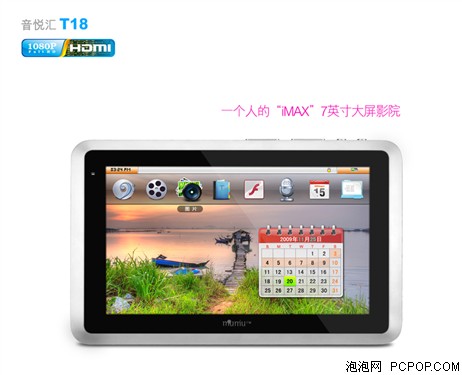 音悦汇T18拥有7寸高清屏幕,分辨率达到了800*480,流线型外观设计,具备HDMI高清输出接口,1080P全高清的解码能力让你感受影院般的震撼;作为家居数码产品,音悦汇T18特别设计了数码相框模式,一键进入,快捷方便,同时配合专业支架,让T18瞬间变身专业数码相框,精彩不止一面!