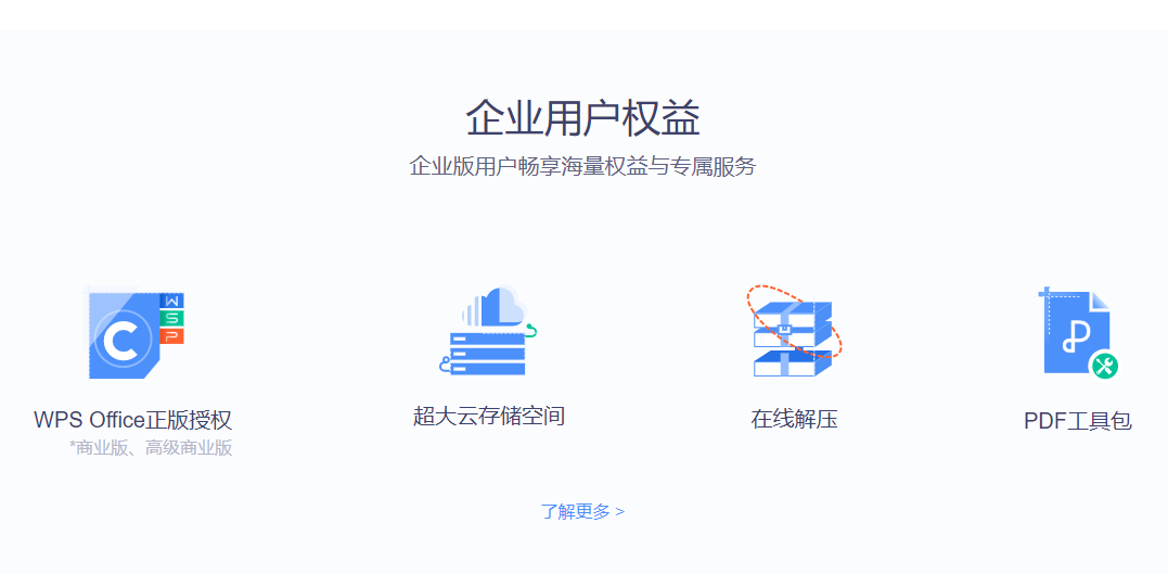 WPS+云办公是金山办公面向企业客户推出的高效、安全的云办公解决方案,不仅提供全平台WPS Office产品,还有文档云存储、在线协作文档、企业管理后台、文档安全服务以及周边办公应用;满足企业文档集中管理、团队高效协同、数据安全管控、随时随地移动办公的诉求。WPS+为企业用户免费提供远程办公、会议等服务。从2020年1月31日起至5月1日,凡3人及以上协作办公的,可免费获得WPS+协作版高级权益。