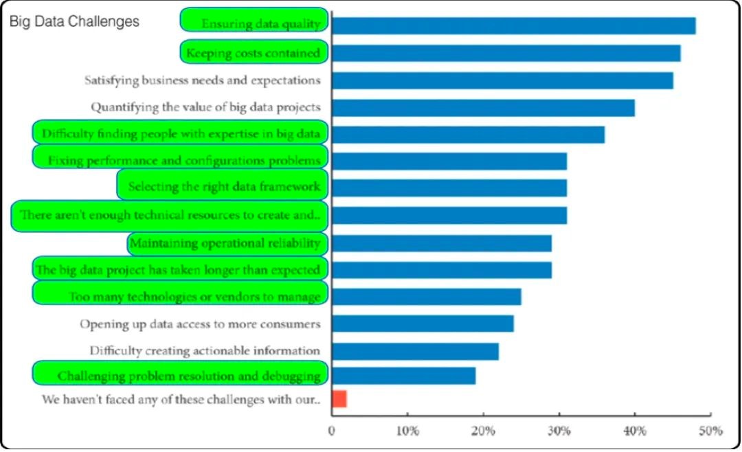 Dimensional Research的一项调查(如上图所示)发现,对于想要实施大数据应用的公司来说,以下问题最为困难: