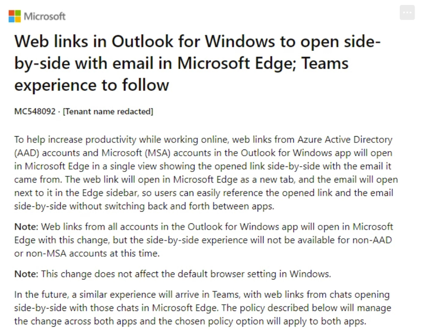 微软称,这样做是为了提供一种“单一视图”,让用户可以在 Edge 浏览器中同时看到打开的链接内容和提供链接的邮件或聊天内容。微软还表示,这项变化不会影响 Windows 系统中的默认浏览器设置,只是在 Outlook 和 Teams 中生效。微软似乎正在逐步在 Microsoft 365 用户中推广这一功能,在推广到 Outlook 之前,IT 管理员会提前 30 天得到通知,后续 Teams 也将跟进。