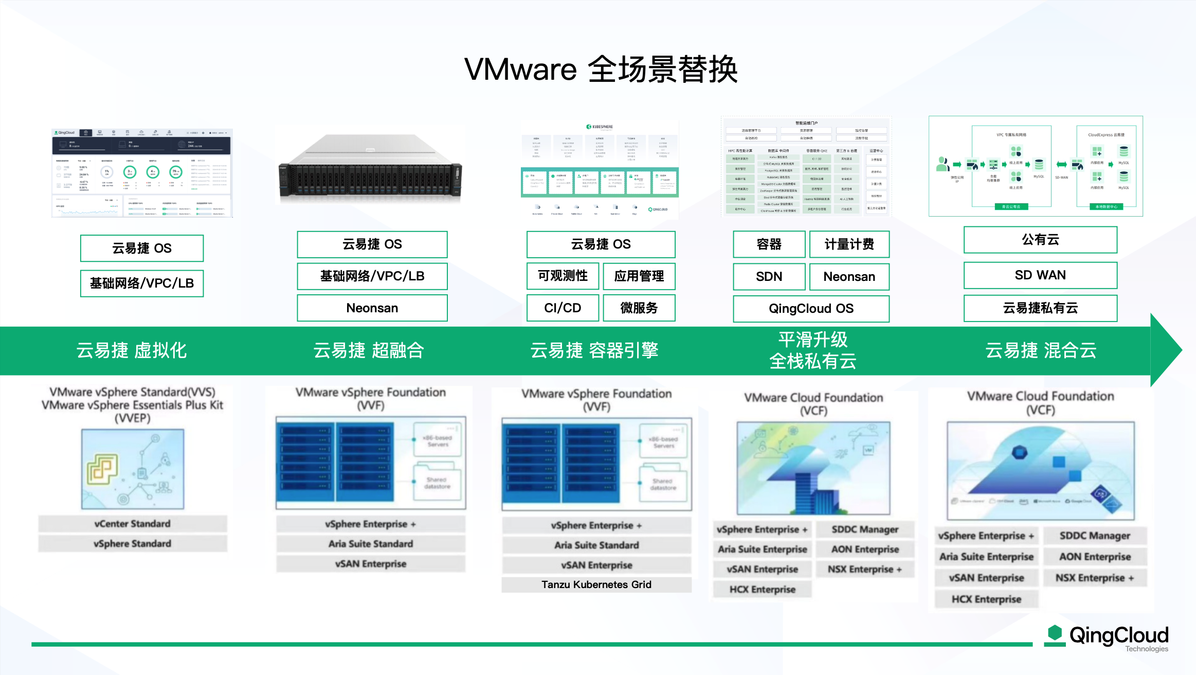 加上去年俄罗斯被全部停止微软服务,意味着国产替代已成为大势所趋,超融合架构正是这一转型的高效之选。针对于VMware国产化替换的方案,青云提供多方案、多场景选择。