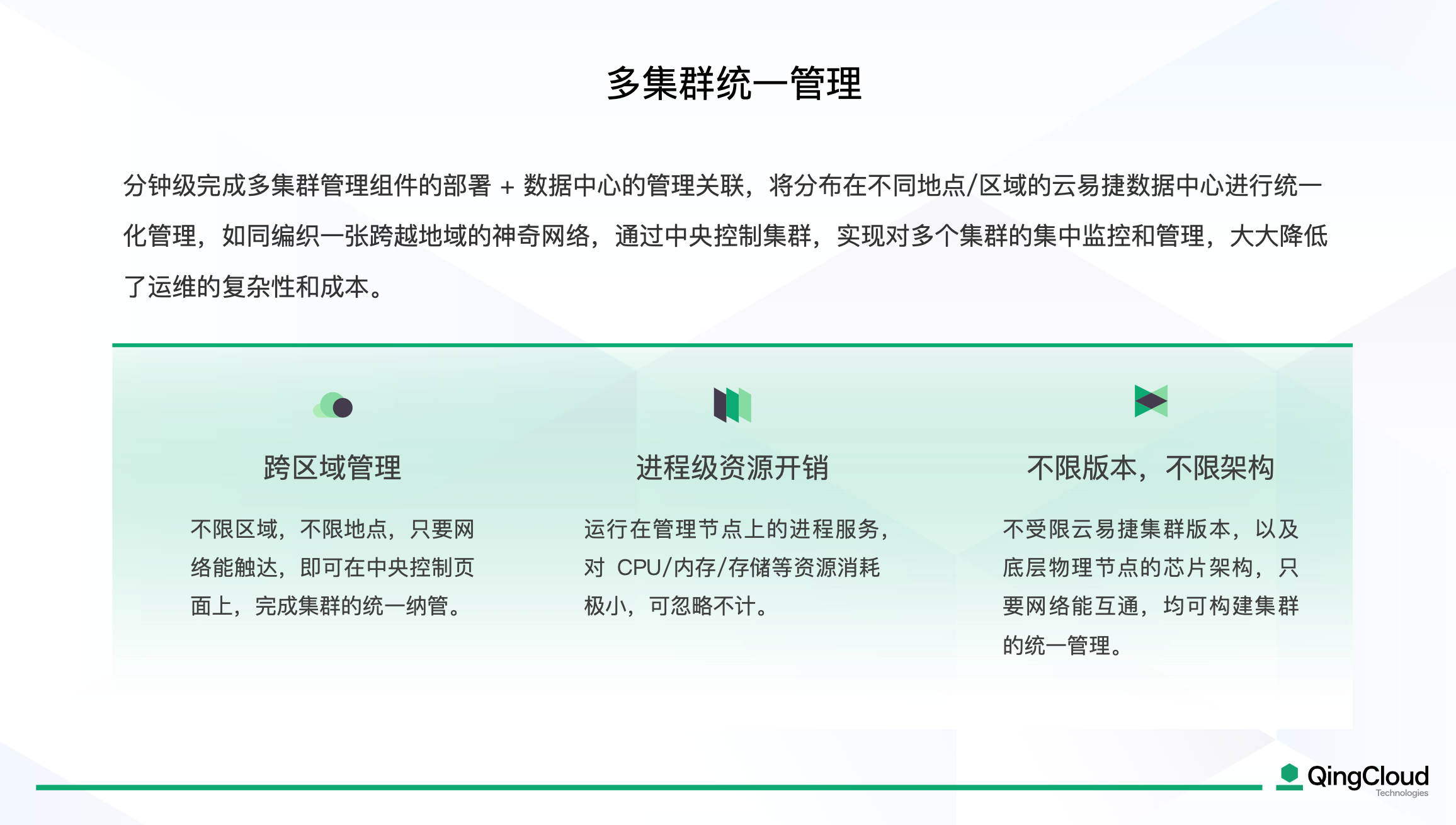 为打破地域限制,用户可以对分布在不同地区的多个云易捷数据中心进行统一管理,通过中央控制集群,用户能够集中监控和管理,实现跨地域协同工作,为企业的全球部署提供了有力支撑。这也为行业内的跨地域协作提供了新的思路。