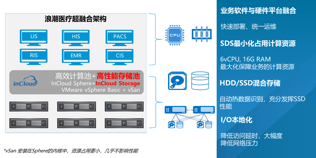 根据以上医院的实际业务需求,浪潮与心医国际共同推出“医院超融合架构解决方案”,将心医的医疗信息化软件平台部署在浪潮超融合架构平台之上,以虚拟机的形式运行,极大提升硬件利用率、降低运维成本。同时浪潮超融合架构万兆互联、副本机制、高IOPS吞吐等,在安全、稳定的基础上保障效率优先。
