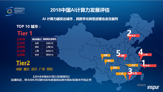 具体到AI计算力方面,今年9月,浪潮与IDC联合发布了《2018中国AI计算力发展报告》摘要版,其中对中国AI计算力城市发展水平作出了综合评估,AI计算力排名TOP5的城市分别是:杭州、北京、深圳、上海、合肥。另有数据显示,杭州、北京、深圳、上海,在城市创新力、独角兽企业量等方面也同样领先。由此可以看出,AI计算力发达的区域和城市,其数字化转型进程也走在前列,数字化转型要从计算力基础设施建设开始。