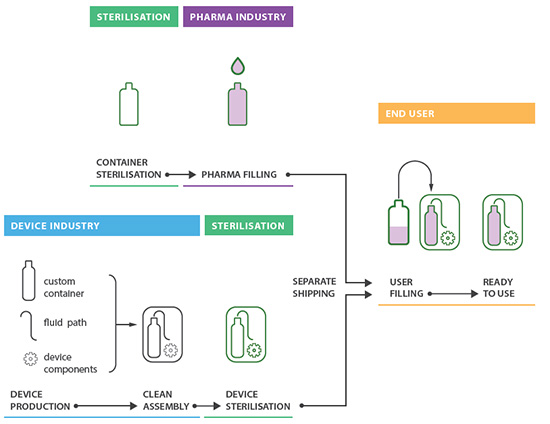 面对这一难题,首先可以想到的解决方案是让两个行业分开,并都继续采用自己的成熟的流程(图1)。根据这一思路,设计师设计出了用户灌装式产品,将药物和装置放在不同的包装内,用户需要将药物灌装到给药装置中。市场上已经出现这种产品,例如一次性胰岛素装置。这种方法意味着消毒过程已经完成;每家生产商都得以保持其原有的供应链;装置制造商无需负责处理药物,药物灌装者也无需进行组装操作。无论是从技术角度,还是从质量、责任和风险管理的角度,这种方法都对厂家有很大的益处。