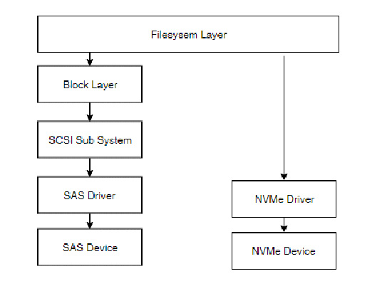 随着硬件性能的提升,内核中的网络栈和存储栈带来的性能瓶颈越来越明显,为缩短io路径、解决NVMe SSD在传统IO栈上的性能问题,Linux内核从4.x开始引入了新的NVMe IO栈,如下图,可以看新的IO子系统完全摈弃了传统的通用块层和SCSI子系统: