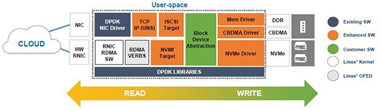 SPDK(Storage Performance Development Kit)是由Intel发起,用于加速使用NVMe SSD作为后端存储的应用软件加速库,该软件库的核心是用户态、异步、轮询方式的NVMe驱动。与内核态的NVMe驱动相比,它可以大幅度降低延迟,同时提升单CPU核的IOPS。其架构如下: